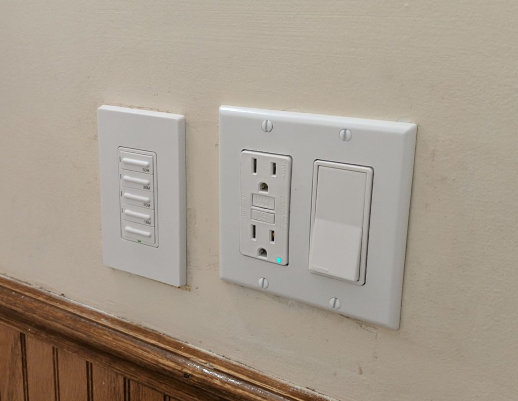 Now the customer has their elegant multi-function timer switch for the exhaust fan, GFI-protected sockets, and easy-to-clean switches & outlets.