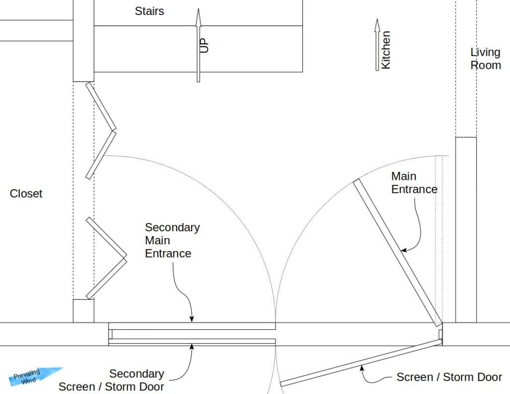 Switching to a single door solved those problems and more. A single door gave the freedom to reverse the swing on the screen/storm door. That solved the wind-damage risk, and also prevented its ability to close on their ankles. It also changed the angle the main door could swing open which allowed it to seal against the wall despite the door knob preventing it from slamming by the action of the breeze.